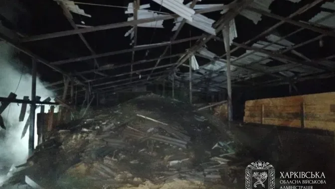 Внаслідок атаки дрону горить склад з насінням в Харкова області. Пожежники та рятувальники працюють на місці.